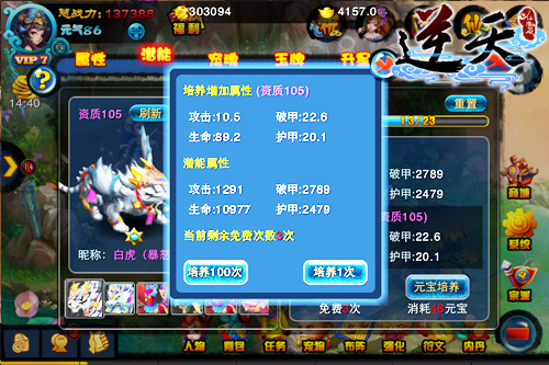 提升宠物潜能能够大量增加宠物的属性,每一点潜能增加的属性值与资质直接相关,宠物资质越高,增加的属性也越高哦~潜能点可以通过金钱培养、元宝培养(暴击出现概率更高)、以及人物升级来获得,如果在培养过程中出现培养暴击的话,还能3倍获得潜能哦。