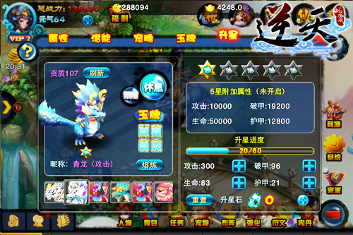宠物可以通过利用升星石来提升自身的四大基础属性:攻击,生命,破甲与护甲。宠物最高可以激活到五星,按照宠物类型的不同,升星后附加的属性的增长情况也不同,比如攻击型的宠物激活五星后攻击属性可以增加10000,护甲增加12800,而防御型的宠物在激活五星后攻击属性只能增加2400,而护甲则能增加25600。升星石每日可以通过进入世界BOSS伤害榜的前50名等方式来获取。