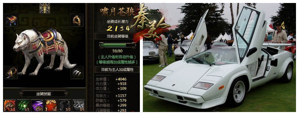 兰博基尼Countach来源于意大利的俚语Coon-tash,意为难以相信的奇迹。难以否认的手游《秦美人》最具传奇色彩的坐骑就是啸月苍狼。可以看出,Countach的菱角、线条、凹陷面,无不彰显出一种野性,进攻性的匍匐状车身造型给人一股级强烈的跳跃感,除此之外,采用高速发动机LP5000对冷却系统,外加竖向气流格栅,剪式车门更是独树一帜,这所有的一切,无疑与手游《秦美人》中的啸月苍狼不谋而合。