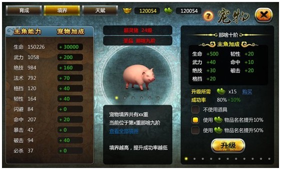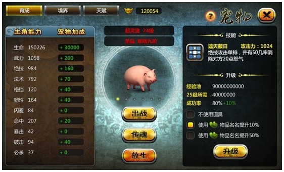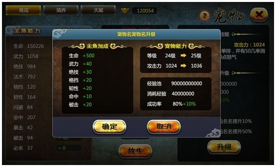 育成:宠物可以通过育成来提升自身等级,宠物升级需要消耗经验池经验,宠物等级上限受主角等级影响。等级越高,宠物自身的绝技攻击属性越高,而且能习得更为强力的绝技。绝技为全体攻击固定伤害,绝技的使用上可以在竞技,闯关等进行灵活的变换。可以使用幸运符提升成功率。