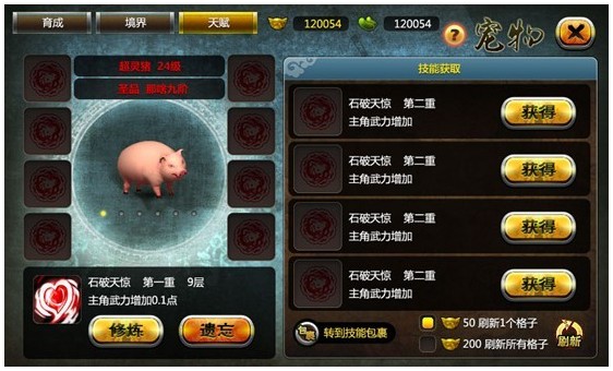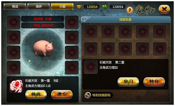 技能天赋:技能天赋种类有生命,武力,绝技,法术,暴击,必杀,韧性,格挡,破击,命中,闪避。共11种,每种技能各有9本对应技能天赋书,共99本技能天赋书。宠物技能槽上限为8,即每只宠物最多可学习8个技能天赋给主角增加能力。每种技能可升级到10层,满10层后,需要有下一阶对应技能天赋书才能继续升级。技能天赋升级有几率会失败,可以使用幸运符提升成功率。