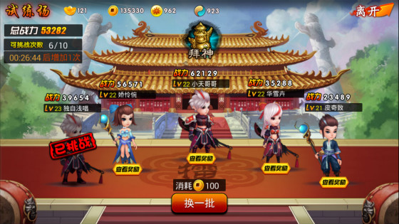 在试练场每日先有10次挑战的机会,之后每一小时恢复将一次。同竞技场一样,每次战胜与否都能获得境界点的奖励。玩家挑战之前可先查看奖励并根据自己的实力,来判断挑战哪位玩家,也可花费100铜钱来更换一批挑战者。