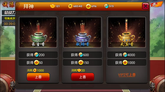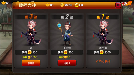所谓三人行必有我师,《囧西游》境界的获取可以通过《囧西游》江湖中成名已久的前辈高人来指点一二寻求修行的突破。玩家每日可通过花费铜钱或元宝进行上香拜神以获取境界,也可通过花费铜钱或元宝对竞技场前三名的大神进行膜拜来获取境界。