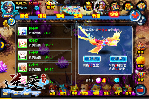 当玩家在进行主线剧情任务时,系统会自动赠送一只名为“孙小圣”的猴子的宠物给玩家。如果玩家想获取更多的宠物,则需要使用捉宠的功能。玩家可以到捉宠的界面随机召唤4只宠物进行降服。