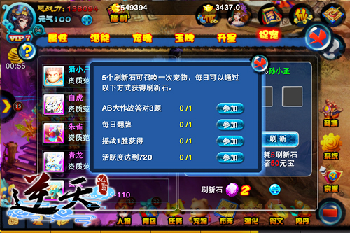 在游戏中,5个刷新石可以召唤一次宠物,而每日可以通过AB大作战答题,每日翻牌,摇战打败对手,以及活跃度达到720等方式来获得刷新石。捉宠功能巧妙地与其他的趣味玩法联系在一起,极大地激发了玩家参与游戏活动的积极性。