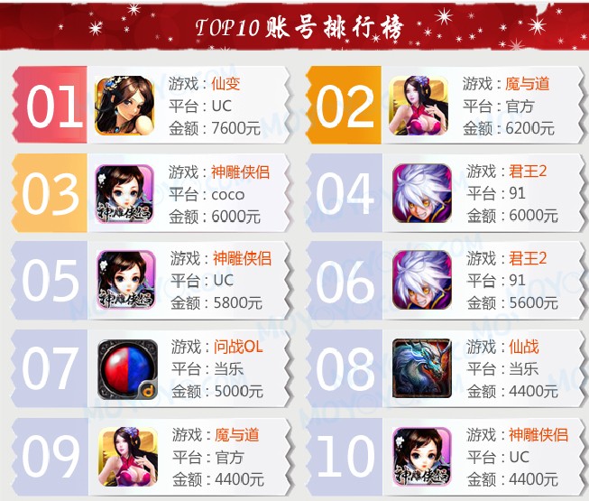2013年底,手游二级市场有哪些动向?账号和道具交易榜谁能荣登榜首?游戏货币在二级市场是否仍继续膨胀,请关注本周手游交易周刊。请您加微信号:shouyoujiaoyi,分享到朋友圈和小伙伴一起欣赏!