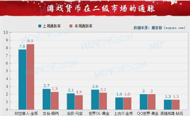 本周时空猎人-金币在二级市场的通胀率继续上升,达到8.5,增长率为8.2%;其他游戏的通胀率基本没有变化。*数据来源于淘宝、职业中介与三方平台,由魔游游(moyoyo.com)整理发布。