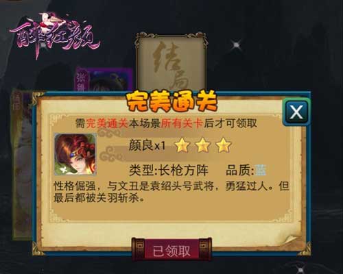 在汉中战役中,玩家将先后遇到杨柏、杨昂、杨丑、杨任等张鲁麾下的名将,还将亲自与其首领张鲁展开激战,此外首次通关战役后还将得到名将颜良的投靠。作为当年袁绍麾下能战善战的两大猛将之一,颜良战力的强横自然不必多说,在游戏中颜良属于蓝色品质的三星级武将,手中掌握的兵种为长枪方阵,是对战骑兵兵种的一大利器。