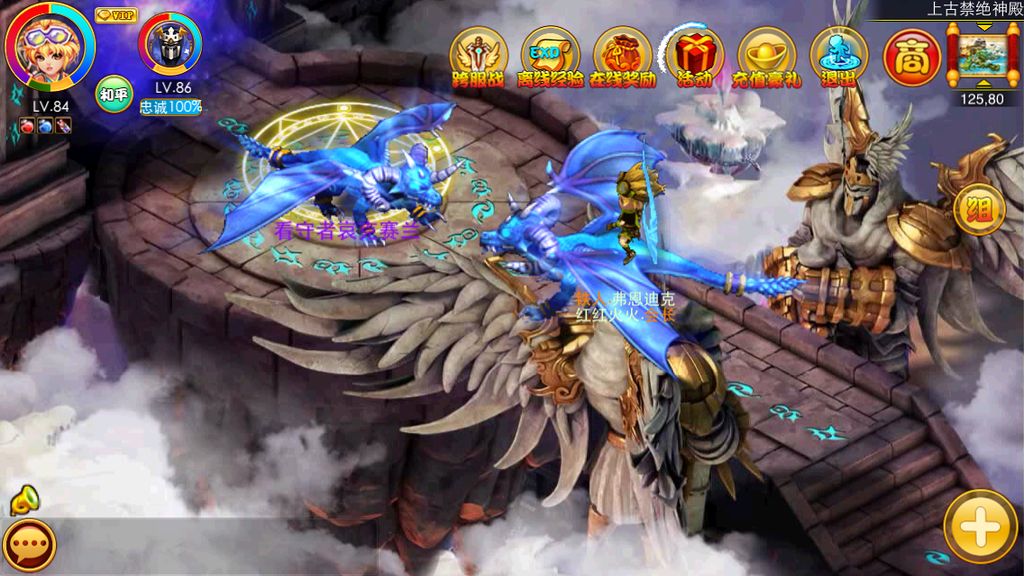 上古禁绝之巅不同于前面七层是由6个BOSS镇守,上古的第八层矗立着威武的光之子和暗之子两位神将,由他们共同守护!上古领域最巅峰——禁绝神殿,拥有最强BOSS和最宏大场景,更有炫目宠物坐骑!