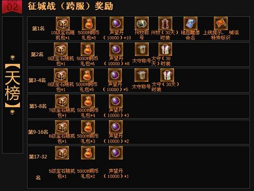 跨服城战中,不仅可以享受各路英雄激烈竞技带来的视觉盛宴,还可以收获丰厚的奖励(包括十级宝石、限量称号、尊贵时装、稀有美人、海量声望和铜币等等)!如果你在单服的比赛中一举夺魁,那么你就是你所在的服务器毋庸置疑的城主!不但可以独享美人嫣儿,更能获得城主称号、城主时装和以自己名字命名圣城雕像的资格!第二名到第四名也有丰厚奖励,并且能获得将军的称号。