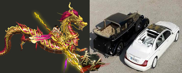 再看手游《秦美人》九幽龙皇,它是以龙为模型,鲜明的颜色展现着九幽龙皇的时尚感外加全身盔甲则彰显龙族几千年以来的高贵气质,而且龙此种生物早已灭绝。九幽龙皇可以堪称现代版迈巴赫2009款6.0T 62齐柏林。