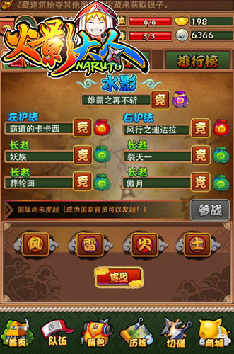 当然,大国在国战中也有也有不好的地方,那就是影者、护法、长老位置的竞争特别的激烈,不是超强实力的玩家能难夺得最强称号。而小国就恰好相反,官员的位置竞争不那么激烈,因此建议新手平民玩家可以选择大国抱大腿,资深平民玩家和小R玩家可以选小国冲冲官员位置。一般来说,火之国是最多人去的,也是高手最多的国家,不过具体情况的看国战才能知道各国的实力。