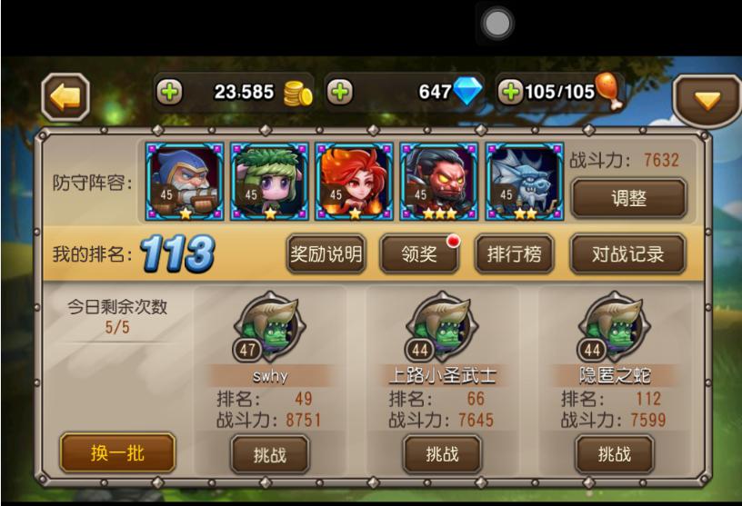 当然,要是点背第一次系统刷新出来的对手看上去都十分凶残,那你也可以选择换一批对手。总之,初入竞技场,小心谨慎才能有更高胜算。