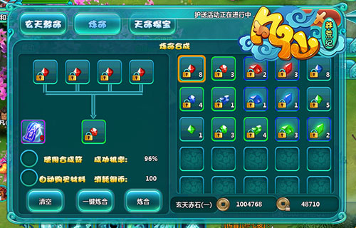 除了探索宝藏外,获得高级宝石的另一个重要途径就是用低级的宝石来合成,打开“炼命”界面,就可以对宝石进行合成操作了。点击右边包裹中的低级宝石,将它们放进合成栏,开始你的炼命之旅吧~要注意的是,合成栏中放入的低级宝石越多,合成高级宝石成功的机率也就越高,如果对自己的运气没信心的话,最好放满四个再进行合成哦!