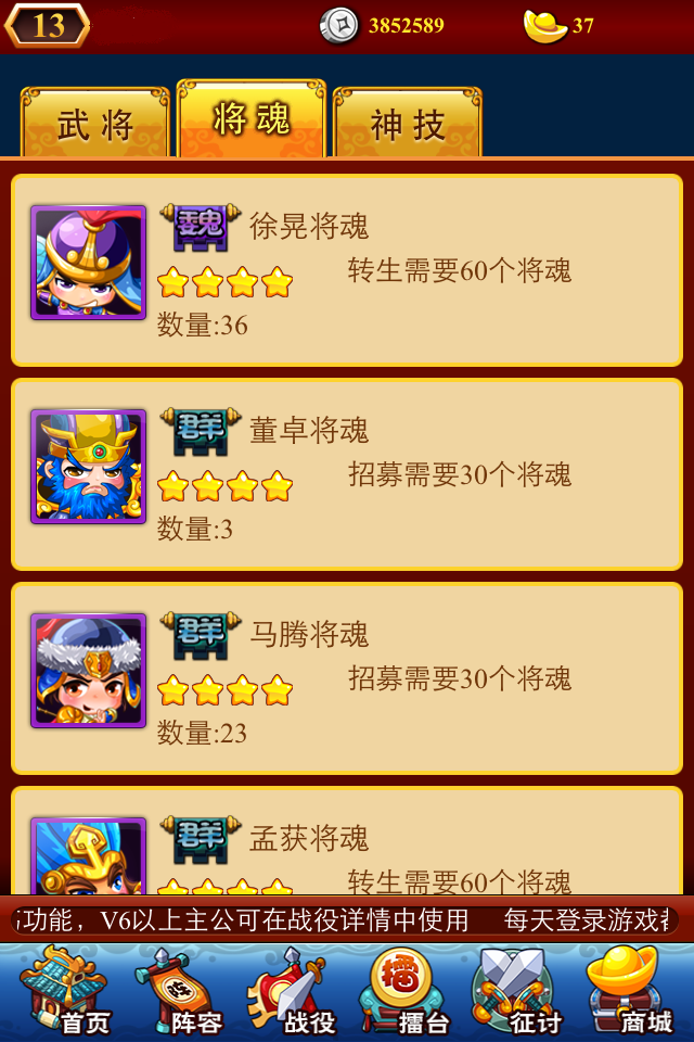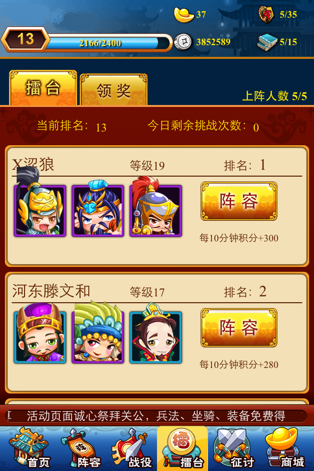 而随着你等级的提升,在《三国志国战版》的主界面中你会发现更多的功能开始开放了。什么?你说你要打擂台?虽然开放就可以上去了,但是这点战斗力浪费每日次数没必要,安心回去通关战役练级去。