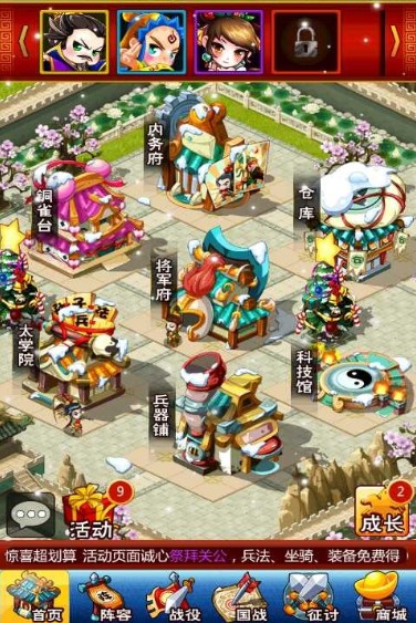 首先你在《三国志国战版》的主界面能看到各大系统功能的场景。比如铜雀台、八阵图、太学院、将军府等等系统建筑,点开介绍后,小编发现大多数场景在中后期才会起到重要作用。而当前我能做的,就是迅速通过新手引导免费获得一位高星级武将——这在初期对你的基业发展是非常必须的。