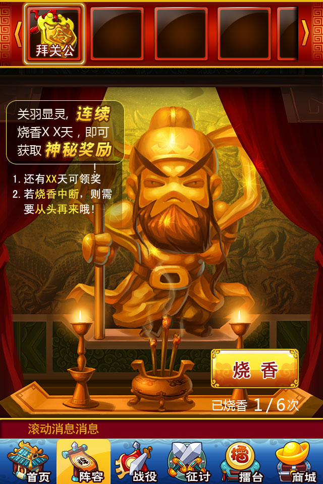 首先,你要每天都去《三国志国战版》中去烧香,不能间断的去烧,才能让你收益更大化。而连接起来就会让你有好处拿。而每日的登录的签到也会有好处,最基本的是有钱花,不管是哪个乱世,钱总是必不可少的,而想当老大更需要钱。
