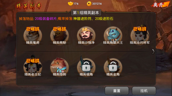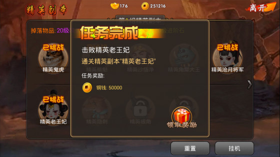 挑战成功每一个精英怪,可以获得大量铜钱和装备碎片,也可能随机掉落神器进阶符和进阶石。挑战胜利后该精英怪图标将变成已完成的状态,每日都有一次挑战的机会,可以不断的发起挑战来获取奖励。不过,花费元宝可重置挑战次数,开启VIP后可以获得挂机以快速通关精英副本。首次打败精英怪将获得任务奖励,哗啦啦的铜钱和境界等统统收入囊中。另外,等级越高的精英副本组获得的奖励将越高哦