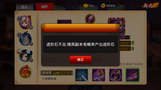 在精英副本通关所获得的等级碎片,可以随机合成一件对应等级的紫色装备,穿上紫色装备将提升玩家角色的战斗值。获取到的进阶石可用来进阶装备,将角色的战斗力再次提升到一个等级上去。