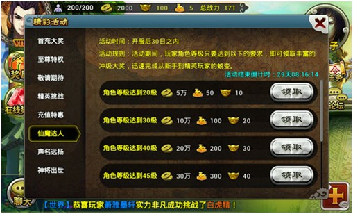 【活动规则】:新服开启10天内,等级榜前100名玩家,将获得额外奖励,如等级相同,则按照主角当前经验高低排序。