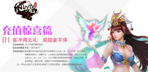 服务器开放后首充的玩家可获得首充大礼包一份,打开获得一百万银两、 紫魅乾坤袋*3、仙兽丹*3、200绑定元宝等超值道具奖励,除此之外充值达到100、300、500、700、1000可额外获得宠物乾坤袋、宠物元灵果、技能残障盒、高级马草、坐骑体力丹等超值惊喜道具。