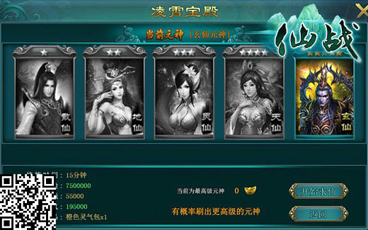 进入凌霄宝殿后,点击“求仙”即可召唤元神进行15-20分钟左右的修炼,元神分为五种:散仙、地仙、灵仙、天仙、玄仙,奖励层层递增,最高的玄仙更是有很高几率出极品橙色灵气包!
