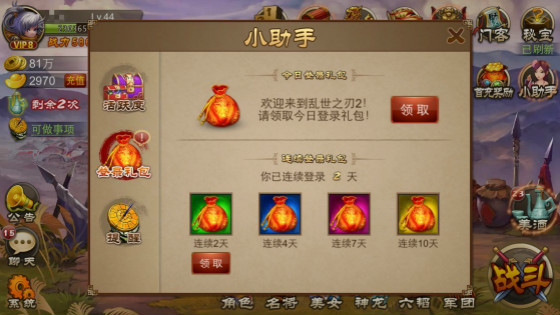 3.新增小助手功能,每日活跃度达到一定值可领取活跃度礼包;