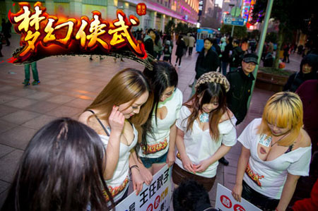 原来,她们是为了争夺《梦幻侠武》的代言权,为了这无上荣耀而做出的大胆举动。在现在这么寒冷的天气里,几位这样的美女站在闹市区必然会吸引许多屌丝的目光。许多屌丝更是做出来意外的举动。(至于做了什么就请大家看图自行脑补吧)
