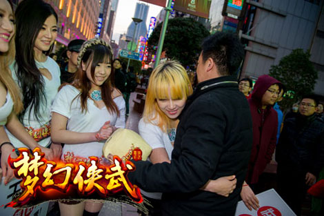 在这几位美女的身上,都贴有《梦幻侠武》微信二维码,只要扫描美女胸前的二维码后就可参与投掷骰子的活动,而且是100%中奖的哦~这不,有的人就得到了跟美女亲密接触,当街拥抱的机会。真是羡煞旁人啊~