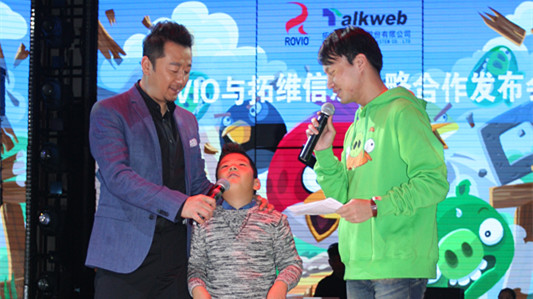石头则一直在场上抱着捣蛋猪公仔跑来跑去,与新认识的“小伙伴”进行各种亲密互动,当提到《愤怒的小鸟》时,才突然想起来什么似的,冲到台前说“我过了50关了”,萌翻现场观众。