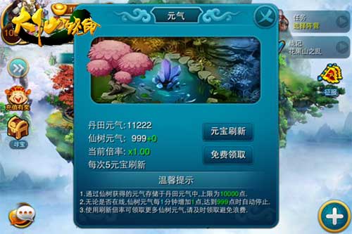 元气是诸天神佛修炼的根基所在,修者炼化元气的多少直接影响到他们修为的高深与否。在蟠桃果树出现之前,《大仙饶命》中鲜有借用外力增加元灵的方式,一般的修者只能通过艰苦的修炼从天地中汲取到少量的元气,而且炼化元气的功法极为罕见。而现在只要服用成熟的蟠桃便可以起到增加元气、强化修为的效果,仙树在吸收到足够的精华之后才可以结出大量的元灵果,占据蟠桃树的人可以摘取元灵并将其中的元气炼化为己用。同一个地域的桃园中拥有多株仙树,该地域中占据桃树的人越多大家获得的元灵数量也会越多,因此对志在夺取元气的玩家而言有更多参与争夺的修者并非都是坏事。