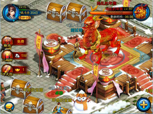 大年三十(2014年1月30日)至正月初七(2014年2月6日)24:00期间,每天的9:30、11:30、13:30、15:30、17:30、19:30、21:30、23:30的洛阳城将会出现一只年兽出来捣乱。各位客官可使用“鞭炮”、“二踢脚”、“冲天炮”对年兽进行攻击,攻击年兽会掉落年兽鳞片、年兽爪子和年兽对角,三者可合成年兽宝藏。