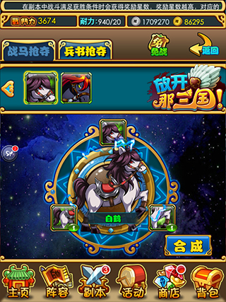 在游戏中玩家可以抢夺其他玩家的宝物,抢兵书、抢战马,以PK决斗为形式,虽然是凭借自身实力来夺取宝物的系统,但对于玩家的谋略也是一项考验!在游戏中抢兵书、抢战马,靠自己的实力去赢取你心爱的宝物吧!