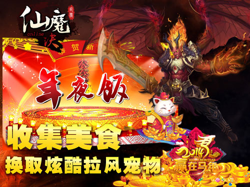 完成斩妖除魔、通关副本、押镖任务、仙魔战场、帮会任务、门派任务都能获得春节期间特有的活动美食一份,收集满这些春节期间特有的节日美食,则能获赠1个“马年的祝福”,打开后有几率获得1-10个“马运齐天礼包”这个礼包中不仅仅能够获得各种意料之中或者意料之外的惊喜奖励,而且还有机会获得马年吉祥圣宠“飞天圣马”一只哦!