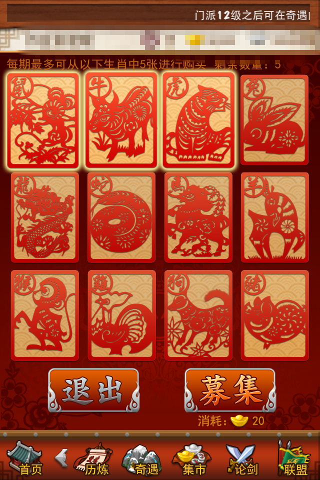 马年将至,马上有钱!12生肖齐报道,翘首恭祝掌门新年如意,早日一统江湖!众掌门有所不知,各位生肖代表可不是空手而来!他们无不为掌门预备了珍贵的金叶子!但俗语云:风险与财富相伴,礼品和谜语齐行!尊贵的金叶子可不能随随便便地送与大家,只有那些智勇双全,武功盖世的掌门才能获此厚礼!活动期间,众掌门可以根据生肖们的灯谜来猜奖,才智最过人的掌门可以获得生肖们准备江湖珍品------500枚金叶子!究竟谁才能获此殊荣?赶快用行动来证明自己吧!