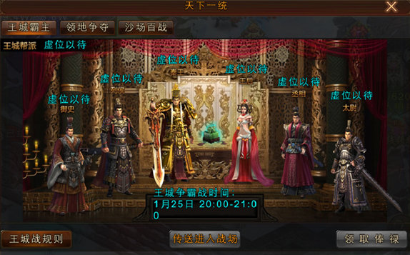 玉玺被持有时间超过20分钟,则城战结束,持有人为秦王。若无人持有超过,则21:00持有玉玺即为秦王。无人持有,则无新秦王。