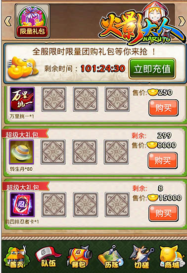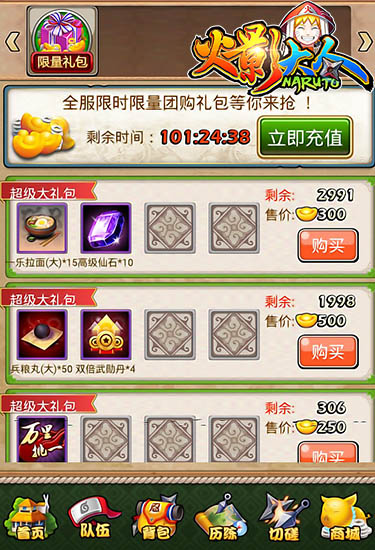 《火影大人》此次限时限量团购活动时间为:1月22日-1月27日,但每个服务器都有一定数量的团购礼包,采用先到先得的方式派放,其中礼包分别有300元宝的一乐拉面(大)*15+高级仙石*10,限量3000个;500元宝的兵粮丸(大)*50+双倍武勋丹*4,限量2000个;最受欢迎的明星团购产品——250元宝的万里挑一机会一次,限量1000个;8000元宝的转生丹*80,限量300个);15000元宝的前四排忍者卡*1,如果你今年运程真的不好,那么就团这个吧,限量10个!
