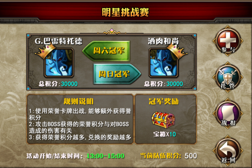 值得注意的是,英雄挑战赛有时间限制,活动结束时还未结束战斗,则视为失败。英雄挑战赛可手动操作,也可自动战斗,活动结束后会根据击败BOSS难度计算积分,发放奖励。英雄挑战赛的奖励包括法球碎片、金币和召唤卡。