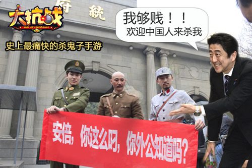 近日,一张日本首相安倍晋三美国参院议员时,点头哈腰请其入座的照片在网上疯传。对于照片中安倍谄媚贱俗的笑脸,中国第一抗日手游《大抗战》表示,对于此类人,必须用一句俗语来形容:过街老鼠,人人喊打!
