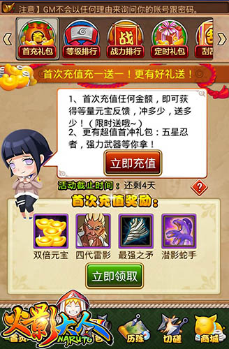 新服福利一:首次充值,获得的元宝翻倍,并送五星四代雷影紫卡、四星最强之矛装备(可与君麻吕配缘)以及三星忍术卡潜影蛇手。该礼包中,光是四代雷影就已经物超所值,因为此卡五星忍者中也算是中上等水平,可以一直用到后期!而另外两个道具最强之矛和潜影蛇手的配缘忍者都是前期易出的忍者,实用性非常强。