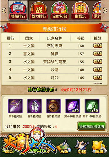 新服福利三:等级排行。也是开服钱七天,玩家可以在活动页面看到等级排行的榜单,等到活动结束时,等级榜第一名可以获得绝版五星武器:草の剑(大蛇丸的专属武器);等级榜第二名可以获得绝版五星防具:影之战袍(与二代火影配缘);等级榜第三名可以获得绝版五星:琥珀净瓶(与奇拉比配缘);等级榜第四到十名可以获得:高级仙石*50;等级榜第11-30名可以获得:普通仙石*50。