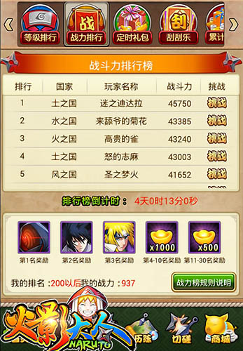 新服福利二:战力排行。开服前七天,玩家在活动页面都可以看到战力排行的榜单,玩家可以在该页面挑战其他玩家拿经验,也可以看排行版的倒计时,待到活动结束,战力榜前30的玩家都可以获得绝版紫卡和大量元宝。第一名可以获得绝版攻击紫卡:宇智波带土;战力榜第二名可以获得绝版攻击紫卡:宇智波佐助;战力榜第三名可以获得绝版攻击紫卡:四代目;战力榜第4-10名可以获得:1000元宝;战力榜第11-30名可以获得:500元宝;
