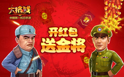 拿红包,送金将!中国第一抗日手游《大抗战》新春巨献,超多福利红红火火齐上阵,让你这个春节长假七天乐不停!史上最给力新春活动,卫立煌、李家钰、傅作义,众多珍贵金将免费获取。全民畅享,名将抗日大时代来临!