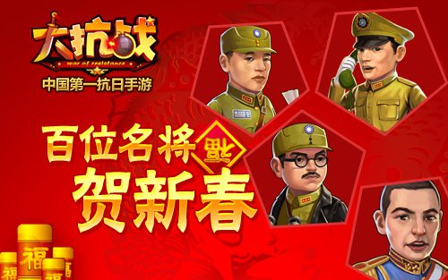 马年到,贺新春!百位名将与你痛快杀鬼子,迎接新年到来。《大抗战》依据八年抗战史实高度还原200位抗日名将在晚会中首次全员出现。唱着胜利赞歌,走着整齐方阵,百位名将纷至沓来!走在前排的正是开国元帅代表:朱德、彭德怀、聂荣臻、罗荣桓。紧接着出现的是抗日十大名将:薛岳、张灵甫、张自忠等。每位名将都为玩家送上了独有新春祝福,与他们一起,重温抗战的辉煌与荣耀!