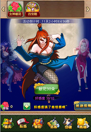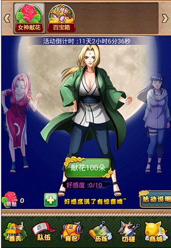 活动内容: 活动期间每充值一元获得一朵玫瑰,玫瑰可以先给不同的女神,女神好感度满后可获得女神的回馈:(好感度满了更可欣赏女神私密照片哦~)其中,雏田需要1朵玫瑰提升1点好感度,小南需要10朵,照美冥需要30朵,春野樱需要50朵,纲手需要100朵,而每个女神都需要10点好感度才能获得回馈。