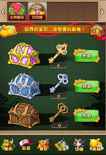 活动内容:活动期间,上架神秘百宝箱,开启百宝箱的钥匙可以在历练获得,也可以直接花元宝购买。