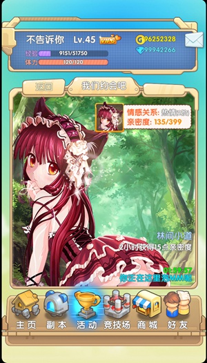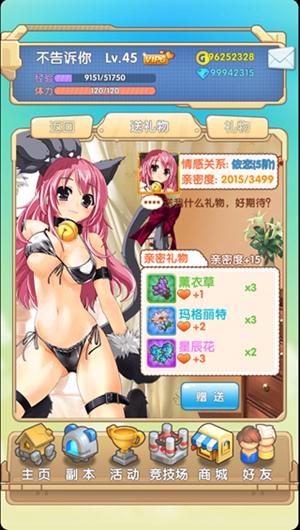 玩家作为游戏的主角和每个妹纸都有一定的感情基础。同妹纸一起战斗、送妹子礼物等方式能提高妹纸对你的好感度。等到妹纸对你的好感达到一定程度时,你可以尝试向妹纸告白!告白后,你们的关系就会有一个质的飞越,达到一个新层面!最后的最后,你和妹纸的关系还有四个不同的分支,想做恋人还是想做炮友任你选!这种和现实相似但又好上一万倍的发展,各位屌丝们还在等什么,快来《爱妹大作战》把妹!只要努力,女神都能抱回家!