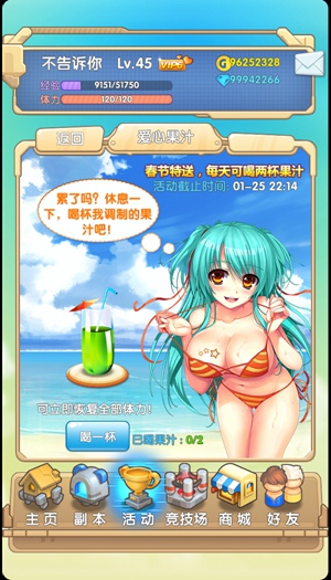 活动说明:活动结束后,果汁恢复至每天1次,体力购买有VIP限制。