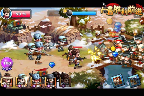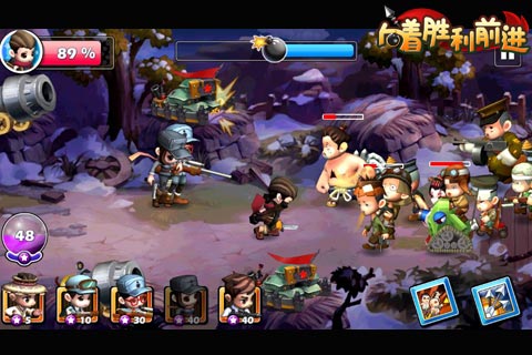 这关的敌兵比较多,但是除了偶尔出现的长枪兵、相扑和坦克,几乎没有群攻的敌兵,所以大量招募低消耗兵种对拼是个不错的办法,搭配飞天神网对付敌方的大块头,就可以轻松过关。此时若可使用银币升级胡队长,较高的血量和对低血量敌兵的范围攻击,可以有效压制敌兵。
