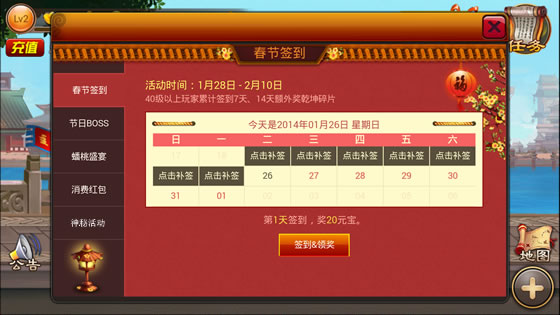 准备回家过年的囧友们注意啦,《囧西游》年终奖来啦。从1月28日开始至2月10日连续14天,每日签到即可获得元宝,连续签到天数越多奖励越丰厚。签到14天,735元宝轻松领回家。活动规则简单明了,登陆游戏进入春节签到界面,小手轻轻一点元宝到手,不费吹灰之力轻松拿元宝。(那个,可能就是浪费点小流量。)